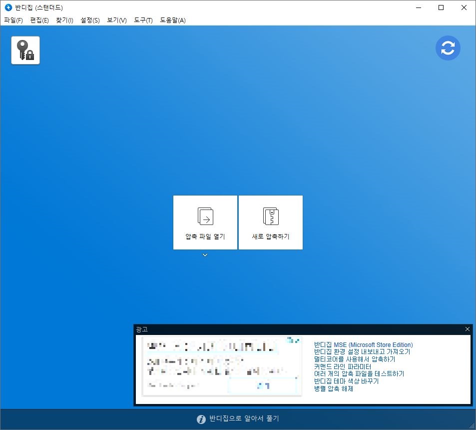 위의 화면은 반디집을 실행시켰을 때의 화면입니다. 아마 프로그램을 설치하시게 되면 볼 화면일겁니다. 처음이자 마지막으로 보게 될 화면일겁니다. 저희가 보통 압축프로그램을 사용할 때, 압축을 풀려고 사용하지 실행시켜서 사용하진 않으니깐요... 제가 무료버전을 쓰고 있어서 그런지 광고도 보이네요. 왼쪽 위의 열쇠와 자물쇠 그림은 제품등록이고 오른쪽 위에 원형 화살표는 업데이트가 있다는 표시입니다.