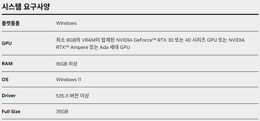 해당 프로그램을 실행하기 위해서는 다음과 같은 요구사양이 마련되어 있어야 합니다. 윈도우 11 OS 에서 NVIDIA GPU는 RTX 30 또는 40 시리즈가 필요합니다.