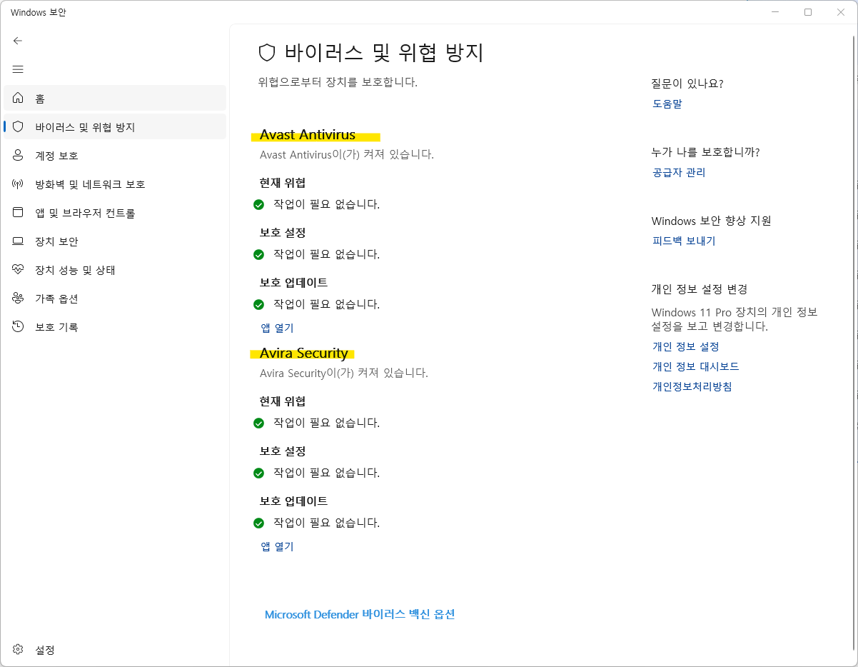바이러스 및 위협 방지 화면은 사람마다 차이가 있을 수 있습니다. 저의 경우는 2개의 보안프로그램을 설치했기 때문에 아래와 같이 보입니다. 따라서 저는 2개의 프로그램에서 실시간 감시를 잠시동안 해제했습니다. 보통의 경우라면 백신 프로그램 이름이 아니라 '바이러스 및 위협 방지 설정'이라는 문자가 보입니다. 해당 문구 아래 '설정 관리' 라는 문자를 눌러서 '실시간 보호'와 '클라우드 전송 보호'를 끄시면 됩니다. 설치가 끝났다면 다시 활성화 시켜주세요.