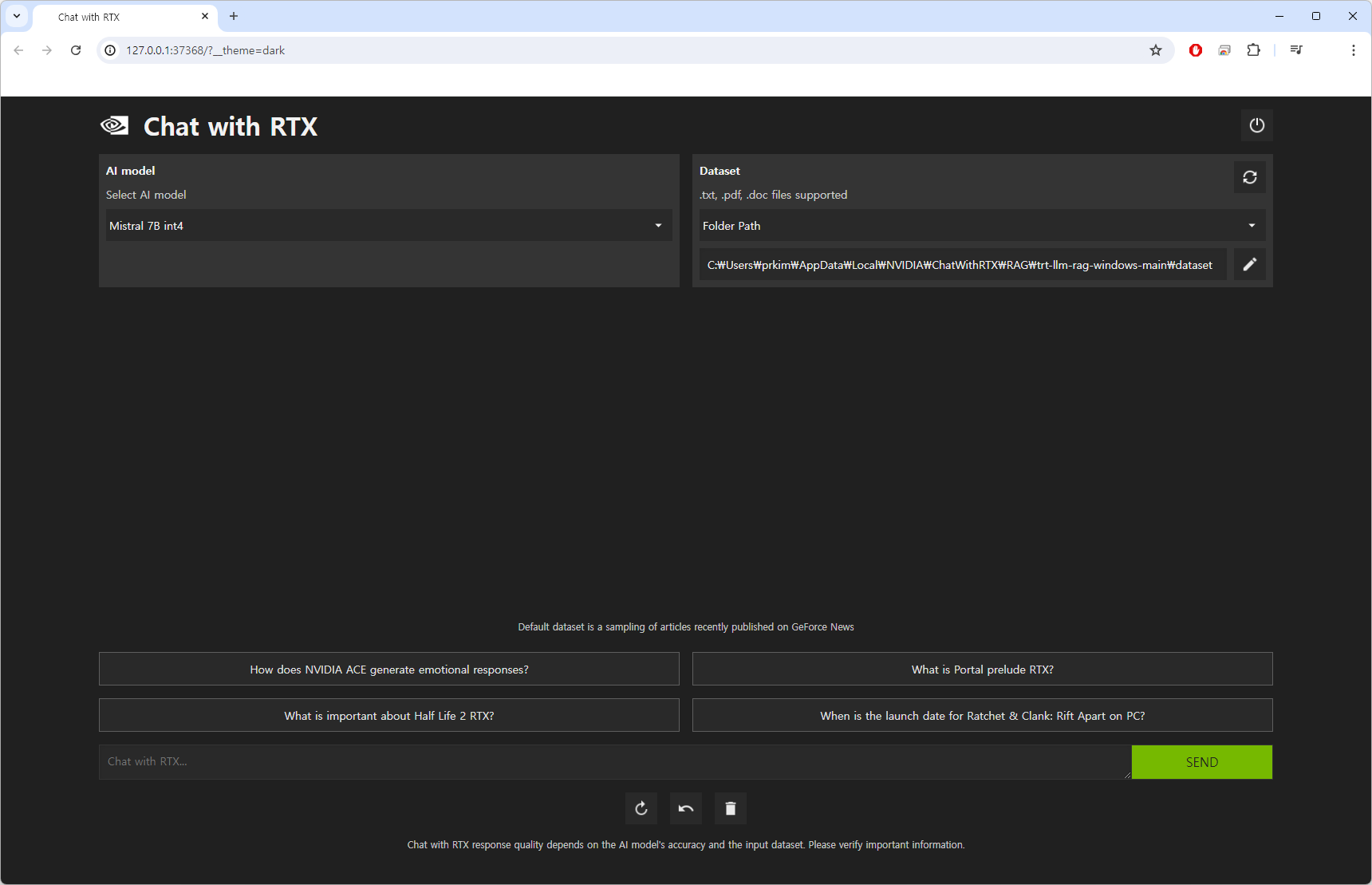 기다리시면 아래와 같은 창이 새로 뜹니다. 현재는 AI model은 Mistral 7B int4만 사용가능 한 것 같습니다. 데이터셋은 짧막한 설명에서처럼 자신의 .txt, .pdf, .doc 파일이 포함된 경로를 지정해주시면 됩니다.