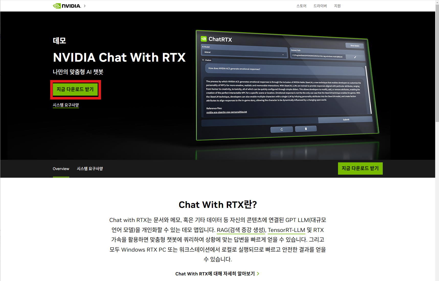 Chat With RTX와 함께 맞춤형 LLM 구축 페이지에 접속해서 '지금 다운로드 받기'를 누릅니다.